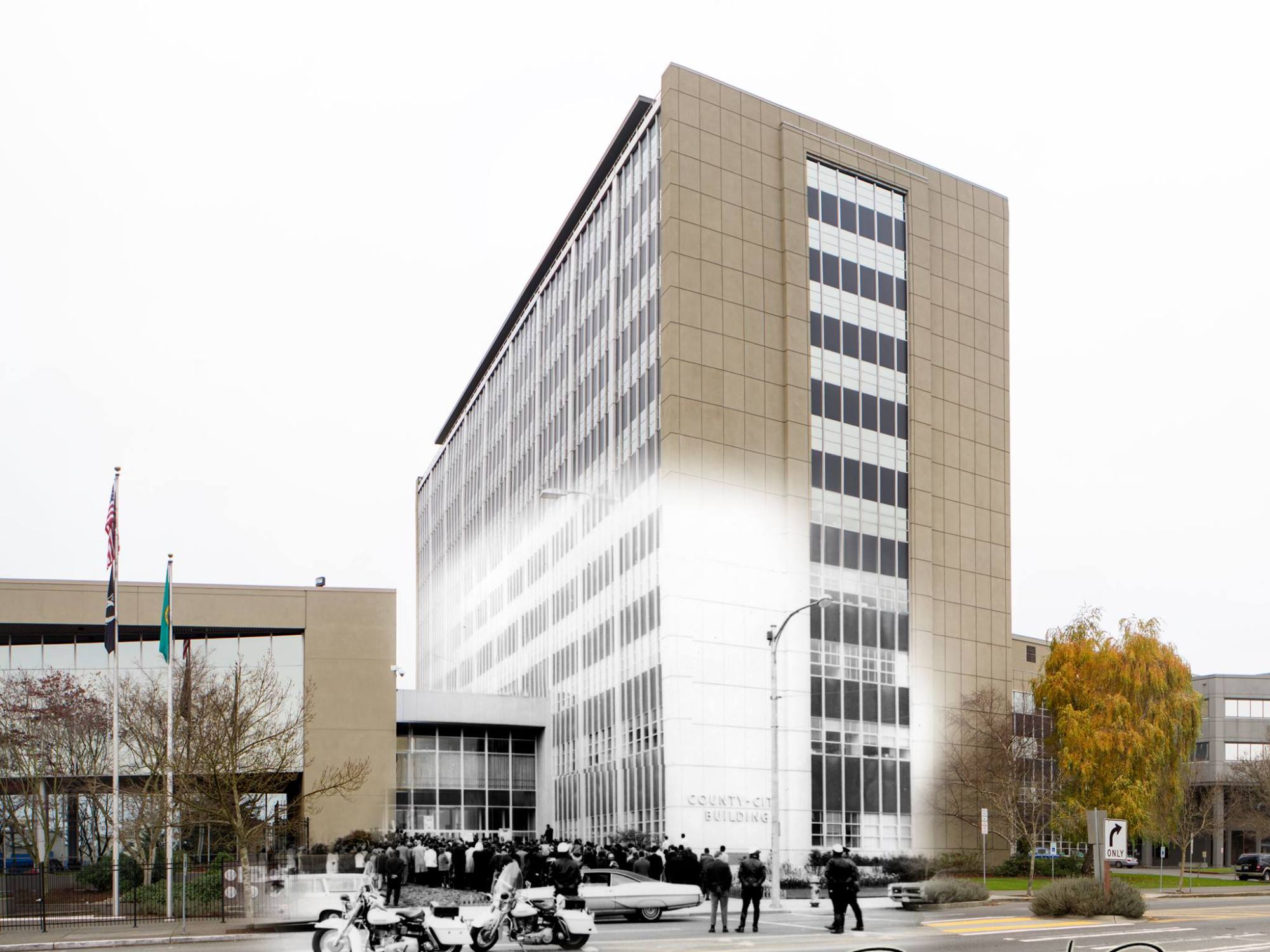 In April 1968 the County City Building on Tacoma Avenue was barely a decade old. Having replaced the towering 1890 Romanesque Pierce County Courthouse, the building had hardly earned a place in the region’s history but that was about to change. After Martin Luther King Jr’s assassination on April 4th, Tacoma’s civic leaders, the Ministerial Alliance, the NAACP and civil rights supporters across the region planned a march on Mother’s Day April 7th. It was the first time the government building was the focus of a broad organized civic action with more than a thousand people marching from churches and meeting halls to the steps of local government. The Mother’s Day marches happened across America after Dr. King was killed in Memphis but in Tacoma it marked an important local movement towards civil rights and social justice. In the weeks and months that followed, Tacoma’s City government was thrown into one of the most tumultuous periods in its history resulting in the resignation of the City Manager, recall of a majority of the City Council, and the intersession of the Governor in order to operate the City. Times were changing and sadness led to constructive non-violent action in the City after this important day in our history.