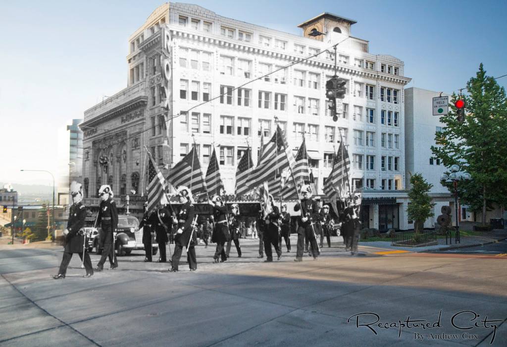 And now for something completely different…Although this looks a little like a Gilbert & Sullivan opera that escaped through the stage door at the Pantages, it’s actually a marching parade of the fraternal 51st Annual Conclave of the Grand Commandery Knights Templar of Washington in May 1938. Not really sure what these guys were all about but they had the best hats, better than the Shriners, the Pythians, the Elks and even the Odd Fellows. We just don’t display enough absurdity and sense of occasion anymore. Interesting that the first guy with a hat like that around here was probably Commander Charles Wilkes who 20 years before the Civil War lead the first American exploring expedition into Puget Sound. Although he came some 49 years after the British explorer George Vancouver, his maps were way better and they pretty much locked up Washington as American Territory. Wilkes could have been a character in a Gilbert & Sullivan opera, arrogant, self important and puffed up like a prancing cartoon flag waver but he had one thing going for him, brilliant mapmakers. The Wilkes expedition maps are a thing of beauty and they cover all of the geography that surrounds us. Like any great artwork they had to begin somewhere. When expedition cartographers began the massive undertaking of documenting evrything around them and drew their first map of a deep water harbor in the summer of 1841 they naturally named it Commencement Bay.
