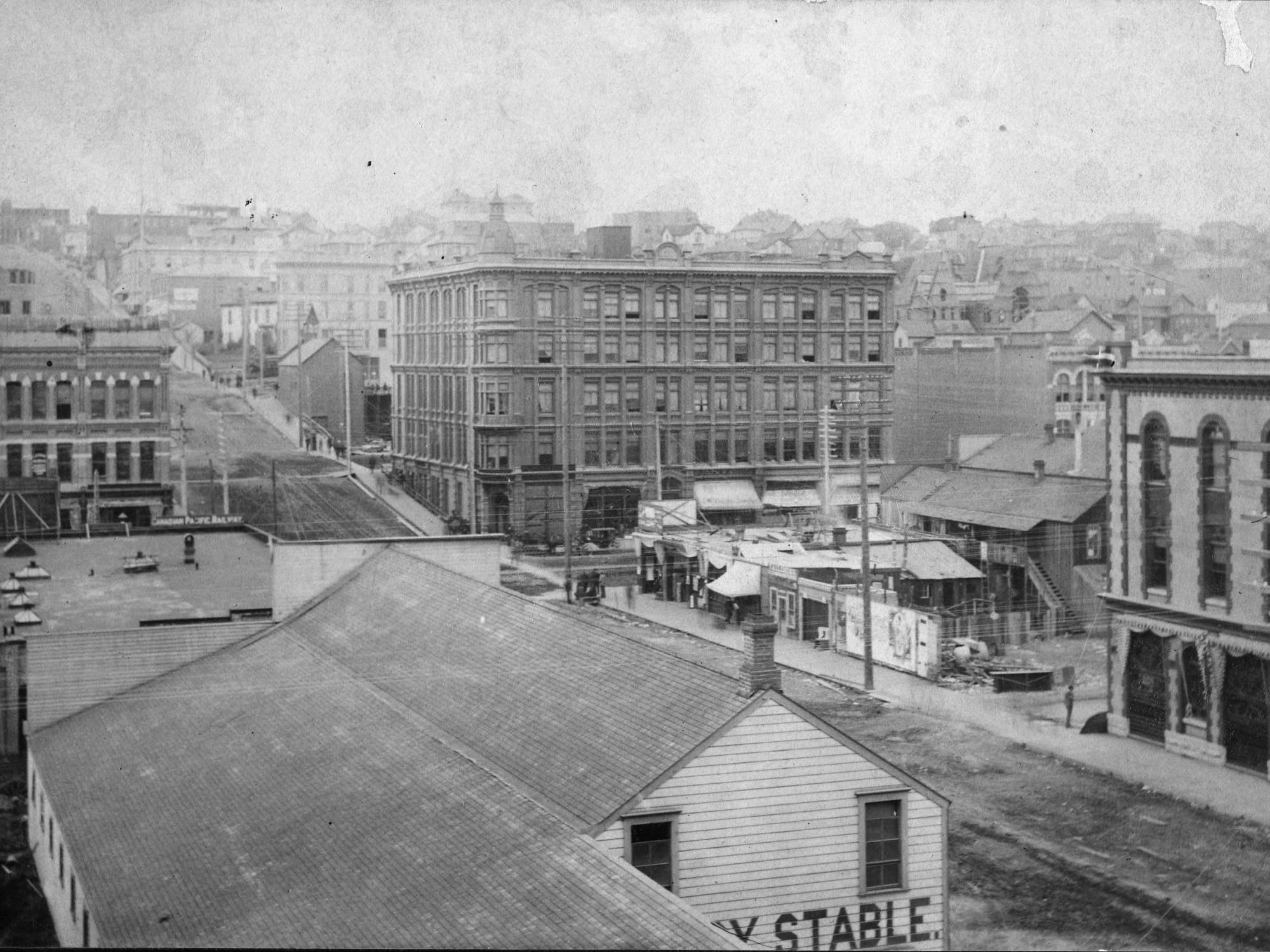 Zooming into this rare photo overlooking the intersection of 9th and Pacific (probably taken from the upper floor in the Tacoma Hotel) several details give away the date. Maybe the second oldest building in the photo is Theodore Hosmer’s wood frame house which was constructed in 1875 and still stands in the photo on its original site facing St Helens (It would be moved to face 9th in 1905 and still stands today). It is peeking out from behind the Bostwick Building which must have just been finished and was a hybrid structure of brick and timber. Its also still with us.