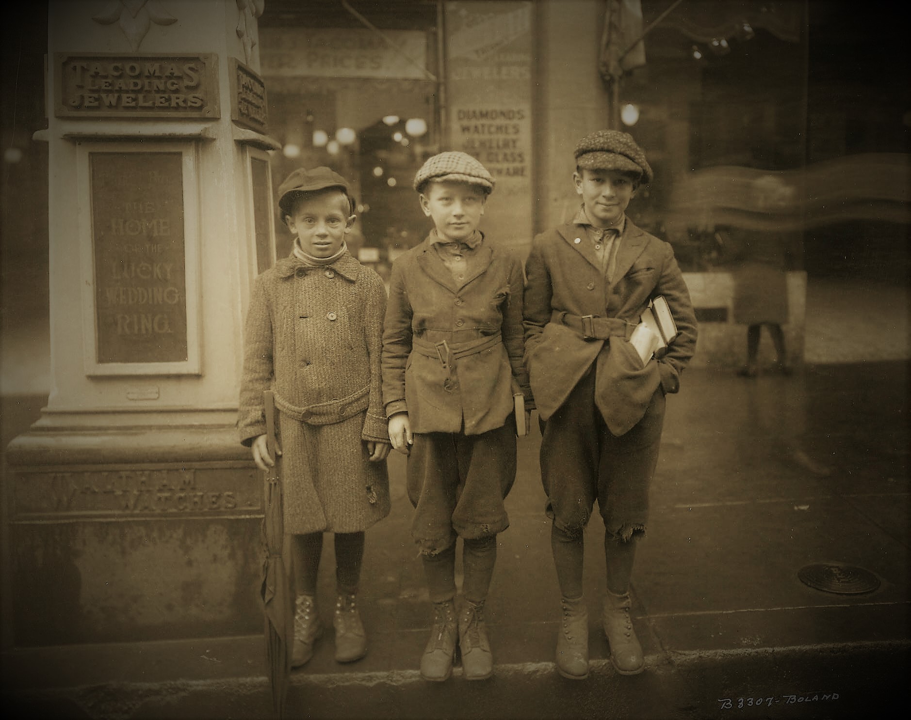 No long complicated backstory here. Just a small street portrait of three boys on the curb in front of Burnett Brothers Jewelers at 934 Broadway in December 1920. The photograph was taken in conjunction with the American Red Cross christmas campaign and the contrast of these torn and patched little fellows in front of Tacoma’s most lavish gem dealer didn’t need any caption or written appeal. Almost a century later the unnamed newsboys still have a message to deliver.