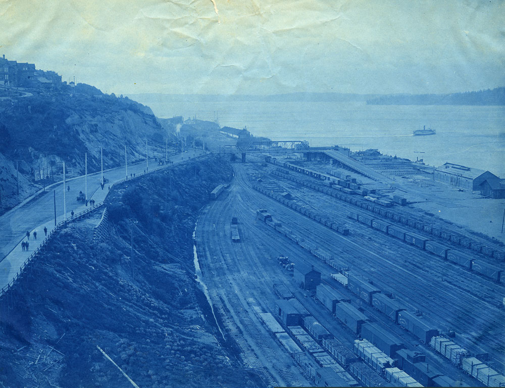 From the same rooftop perch looking north over Commencement Bay, the busy half moon railyards of the Northern Pacific dominate the foreground. The continuous mile long warehouses were still unbuilt and the Prairie Line still found its way through the tangle of sidings to its terminal connection with the NP dock and the Pacific Ocean. This remarkable image shows the wrinkles of a cyanotype paper print and the drama of the transcontinental railroad at its vanishing point conclusion in the center of the view.