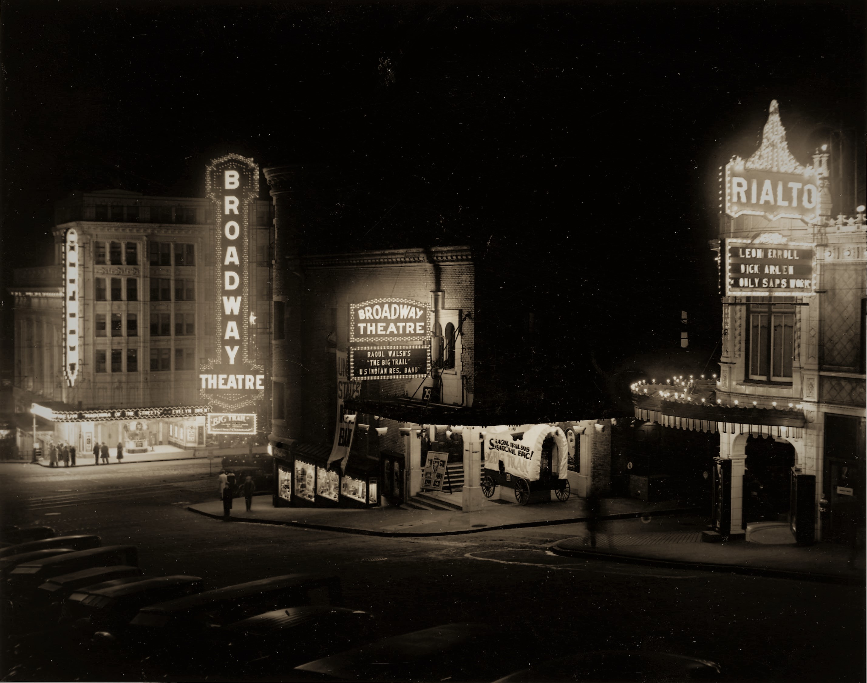 Christmas time in Tacoma’s theatre district with the first tree and topper star just visible behind the Broadway sign, ca. December 10, 1930