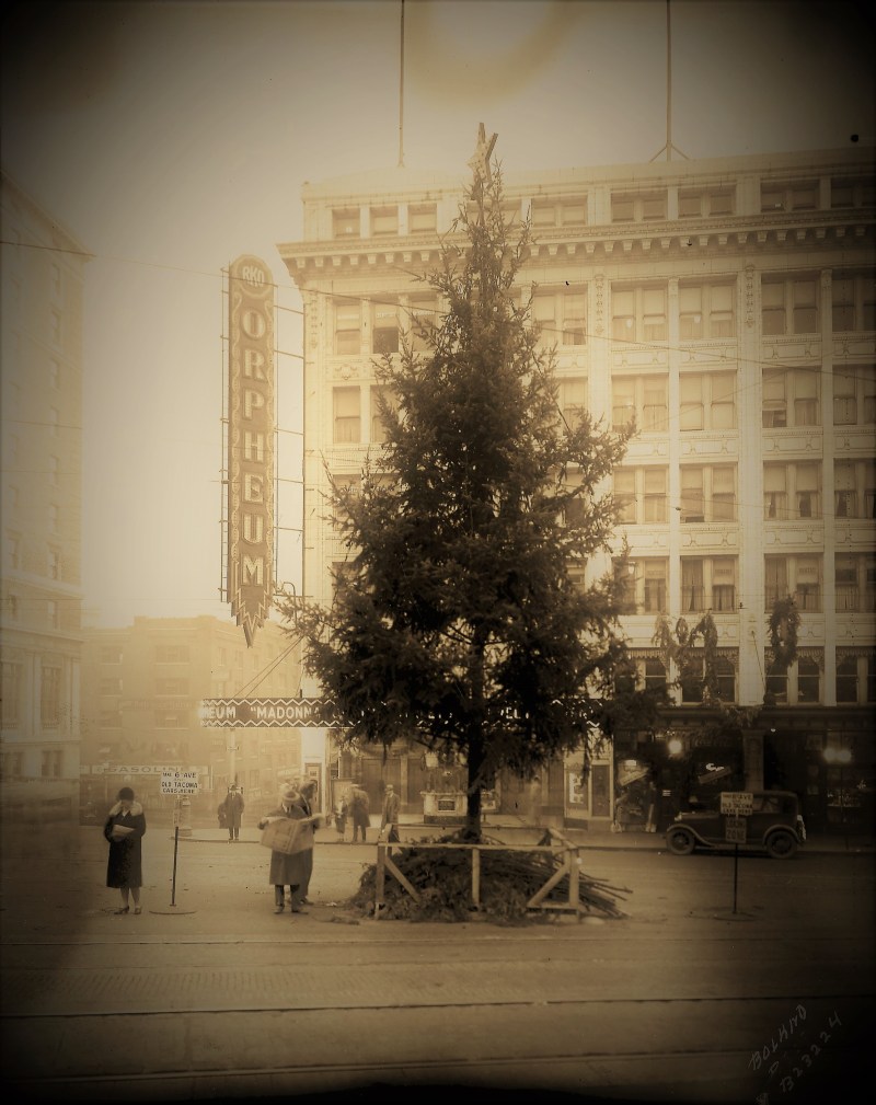 The first time Tacoma placed a Christmas tree in the middle of the busy intersection of 9th and Broadway is a bit of a mystery. Probably the earliest photograph showing a tree in the middle of the street is a Marvin Boland glass plate image now kept in the Tacoma Public Library collection (B23224). There is mention in the Tacoma Ledger of a decorated Christmas tree outside the new Winthrop Hotel in 1927 but no visual evidence of a tree big enough to echo the conifer forest that once covered the hillside. The 30 foot evergreen in Boland’s photo, complete with electric lights, a fenced bed of cut boughs and an illuminated star at the top, was likely the first.