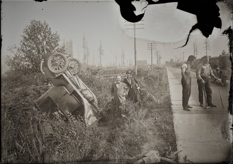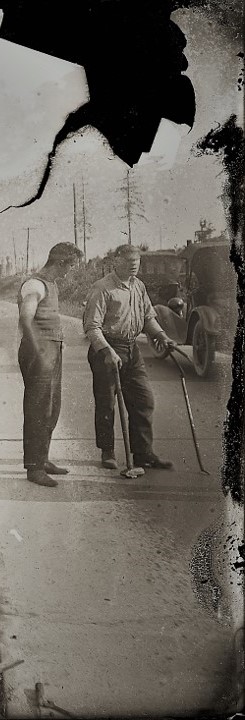 The damaged glass plate image is a study in visual storytelling and photographic composition even though the people and location are unknown. It’s a road movie without motion. The modern paved road establishes a perfect vanishing point in the distance where the sharp road edges and sparse forest of conifers and telephone poles all taper to a long perspective.