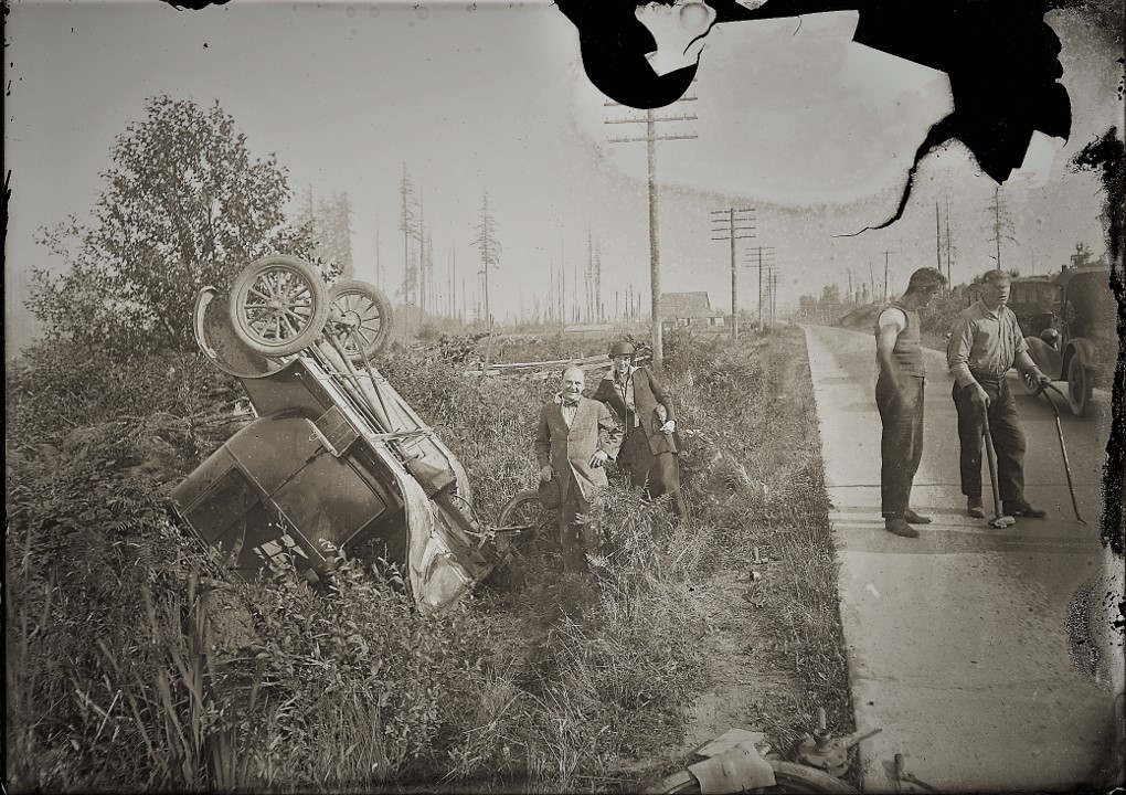 On a summer day sometime around 1920 this small ensemble of actors played out the last act in a drama that involved an automotive miscalculation. Based on the expressions and posture of the driver and passenger, the wreck seems to have been a source of entertainment for the travelers and a source of temporary employment for the roadside wreckers.