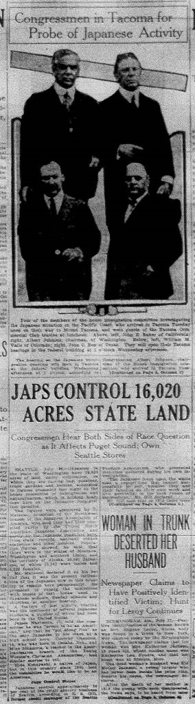 Representative Johnson explained to the full courtroom that the Committee was investigating conditions on the west coast related to the “Japanese question”. From vitriolic statements made by members of the sub-committee, newspaper editorials and previous hearings in Washington D.C., it was expected that the Committee was preparing dramatic changes to Federal laws on limiting immigration, constricting pathways to naturalization and even limiting citizenship rights for native born Americans of Japanese descent. Information gathering sessions were held up and down the west coast that summer but most observers knew that the coming policies were a forgone conclusion and the hearings were little more than a campaign swing.