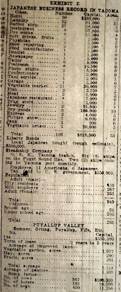 Under oath, the Committee heard testimony from M. Yoshida, Secretary of the Tacoma Japanese Association who presented a careful count of residents, businesses and industry in Tacoma and the Puyallup Valley. Kameji Nutahara, a pastor, S. Kuramoto, a farmer, and Miss Edith Moody, a health department statistician were questioned about birth certificates including several probing questions about whether the birth documents were provided to the Japanese government in order to receive dual citizenship for children. Ms. Moody and the others noted that the certificates were important to families because they documented citizenship for American- born kids but the questions about disloyalty from the congressmen made the unfounded suggestion part of the congressional record.