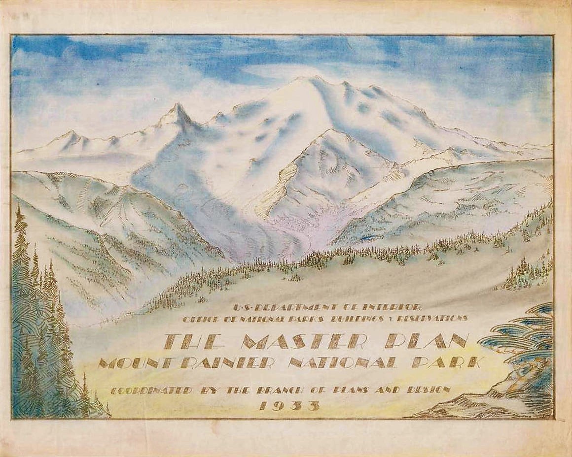 Almost forgotten among the many programs President Franklin Delano Roosevelt launched during the great depression to fend off economic collapse and create jobs was a monumental effort to produce long range plans for America’s National Parks. Beginning in 1929 with a Master Plan for Mt Rainier National Park, more than a decade was spent by the NPS Branch of Plans and Designs developing road and land-use maps, building and structure designs and trail and shelter systems for public park lands, mostly in the west. While the many first generation master plans were amended and expanded over time, the Mt. Rainier Plan became a template for preserving wilderness and building thoughtfully in America’s National Parks.