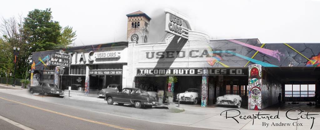 Before Antique Row, the LeMay Car Museum and even the Brutalist parking garages downtown, automobile dealerships and sales offices lined Broadway and St. Helen in the Old City Hall district. The streetcar lines disappeared and buildings that once graced the sidewalks with display windows and shop entries were replaced with garage doors and service bays. In the 1920’s it was the first part of the downtown to give up pedestrian traffic as the theatre district and Winthrop Hotel area became a boundary for walkers and window shoppers. By the mid 1950’s the new Interstate highway would attract auto dealers away from the downtown followed by the big retailers and merchants when the Tacoma Mall was built. It was a familiar urban drama played out in cities across America. It’s the storyline for the colorful animated film “Cars”. Here’s a look at Broadway in the Spring of 1950 and the animation of Tacoma’s graffiti artists a few years ago replacing Cadillacs and Pontiacs with a Technicolor backstory all their own.