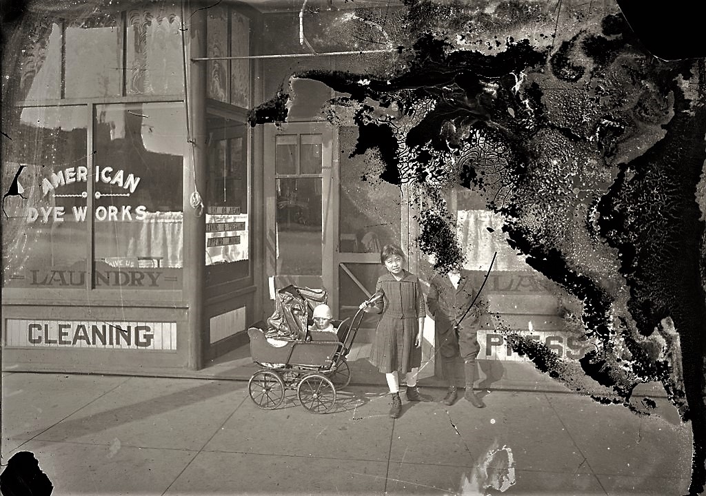 This photograph is perhaps my favorite in the series of glass plate negatives I have been exploring through this Clear as Glass series. I love it for the story it tells about a Tacoma family and an American business during the first half of the 20th Century. My own family, back to my immigrant grandfather, operated laundries and I grew up wandering through the hot, steamy racks of cleaned cloths and freshly pressed shirts. Maybe I appreciate the photo most for the suggestion of steam in the water damage on the negative and the addition it makes to the picture’s story.