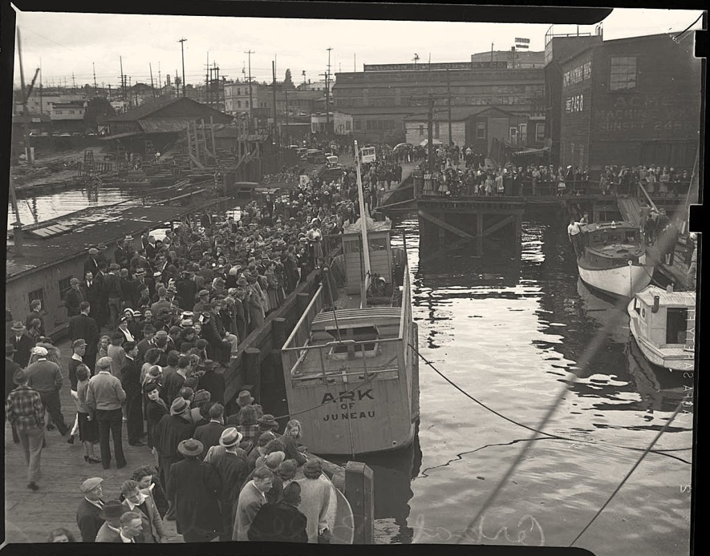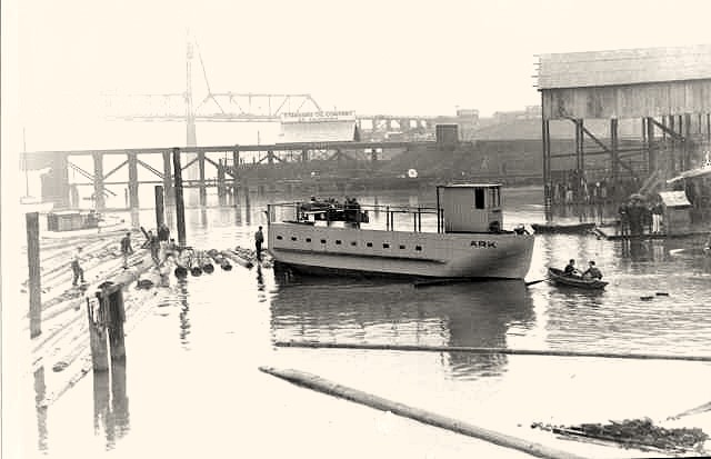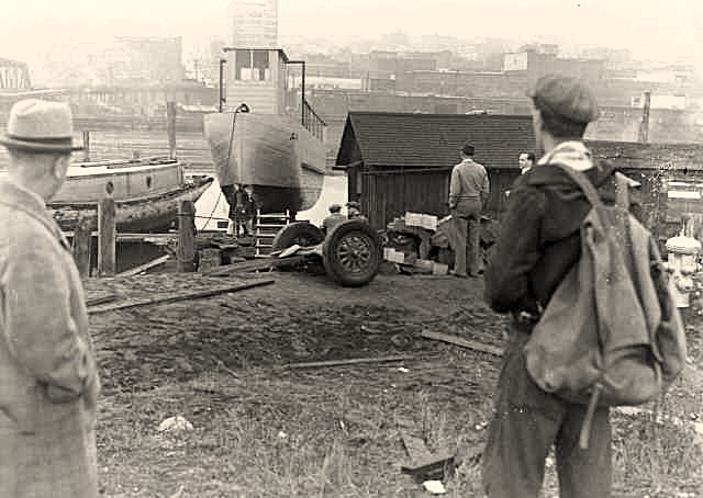 The transcontinental overland journey for the ark and its passengers ended on the Tacoma waterfront in late summer 1938. Over the next year, Paul, Mollie and their seven children transformed the welded frame of a 40 foot long, Buick powered road vehicle into an ocean going vessel. Living in a waterfront shack on the edge of Tacoma’s sprawling and notorious Hollywood on the Tideflats, the Satkos planned the next, maritime chapter in their journey story. The story continues here…