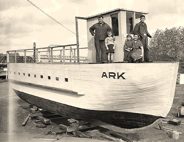 The transcontinental overland journey for the ark and its passengers ended on the Tacoma waterfront in late summer 1938. Over the next year, Paul, Mollie and their seven children transformed the welded frame of a 40 foot long, Buick powered road vehicle into an ocean going vessel. Living in a waterfront shack on the edge of Tacoma’s sprawling and notorious Hollywood on the Tideflats, the Satkos planned the next, maritime chapter in their journey story. The story continues here…